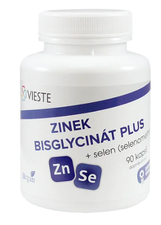 Vieste Zinek bisglycinát Plus je doplněk stravy se zinkem v organické formě s vysokou vstřebatelností – využitelnost chelátovaného zinku (bisglycinát) v lidském těle je až 80%! Zinek se účastní dlouhé řady biologických pochodů a patří k nejhojněji zastoupeným stopovým prvkům. Účastní se syntézy bílkovin, metabolismu mastných kyselin a sacharidů, je důležitý pro dobrý stav kostí, pokožky, vlasů, nehtů, ale i zraku. Zinek přispívá k normálním kognitivním funkcím, k normální plodnosti a reprodukci, podporuje fungování imunitního systému, působí jako antioxidant. Přípravek je obohacený o organický selen, který přispívá k normální funkci imunitního systému a k normální činnosti štítné žlázy.