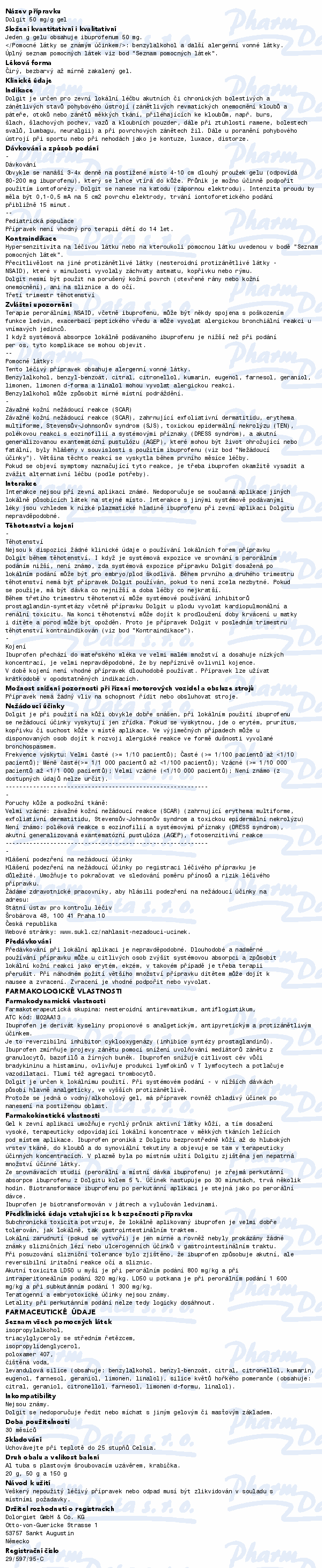 Dolgit gel je určen pro zevní lokální léčbu akutních či chronických bolestivých a zánětlivých stavů pohybového ústrojí a při povrchových zánětech žil. Dále u poranění pohybového ústrojí při sportu nebo při nehodách. Čtěte pozorně příbalový leták.