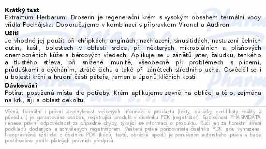 Extractum Herbarum. Droserin je regenerační krém s vysokým obsahem termální vody vřídla Podhájska. Doporučujeme v kombinaci s přípravkem Vironal a Audiron.