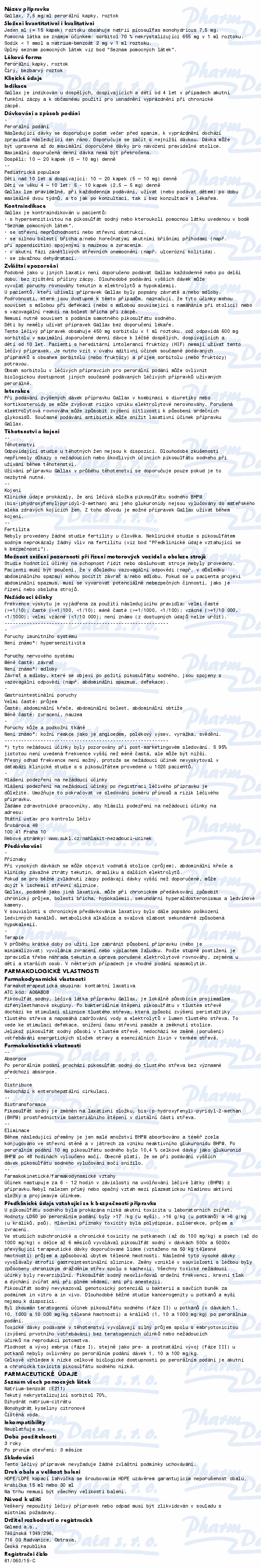 Gallax je indikován k léčbě dospělých v případech akutní funkční zácpy a k občasnému použití pro usnadnění vyprázdnění při chronické zácpě. Čtěte pozorně příbalový leták.