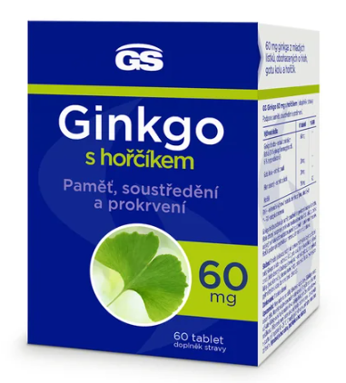 GS Ginkgo 60 mg je prémiový přípravek s vysokým obsahem extraktu ginkga z mladých lístků, obohaceného o hloh, který podporuje prokrvení, a gotu kolu na podporu paměti a soustředění. GS Ginkgo obsahuje 60 mg standardizovaného extraktu z mladých lístků ginkga, který se získává speciální technologií (obsahuje 24 % ginkgoflavonoglykosidů a 6 % terpenolaktonů). Tím je zaručeno vysoké množství nejdůležitějších účinných látek v každé tabletě. Ginkgo biloba podporuje paměť, soustředění, činnost kardiovaskulárního systému a prokrvení mozku i končetin.