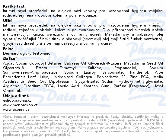 Intimní mycí prostředek na olejové bázi vhodný pro každodenní hygienu vnějších rodidel, zejména v období kolem a po menopauze.