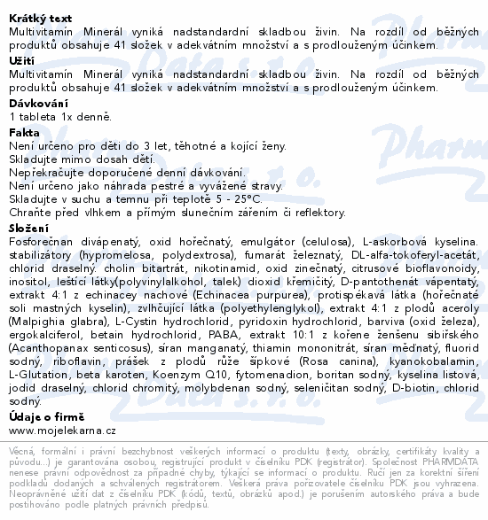 Multivitamín Minerál vyniká nadstandardní skladbou živin. Na rozdíl od běžných produktů obsahuje 41 složek v adekvátním množství a s prodlouženým účinkem.
