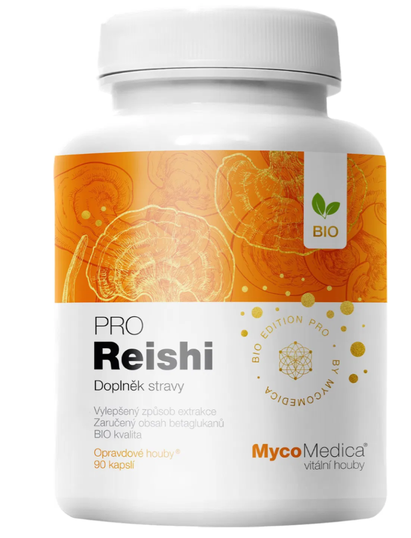 Říkáte si, že houby MycoMedica už nemůžou být kvalitnější a účinnější? Můžou.Díky inovativnímu způsobu kombinované extrakce je možné z vitálních hub vytěžit ještě více účinných látek, ale přitom zachovat jejich optimální poměr. Díky tomu se razantně zvýšil podíl betaglukanů ve výsledném extraktu. A vše nově v BIO kvalitě.Vitální houba Reishi (lesklokorka lesklá, Ganoderma lucidum) podporuje přirozenou obranyschopnost a vitalitu, přispívá k udržení normální funkce oběhového systému a zároveň pomáhá k udržení normální hladiny cholesterolu přírodní cestou.