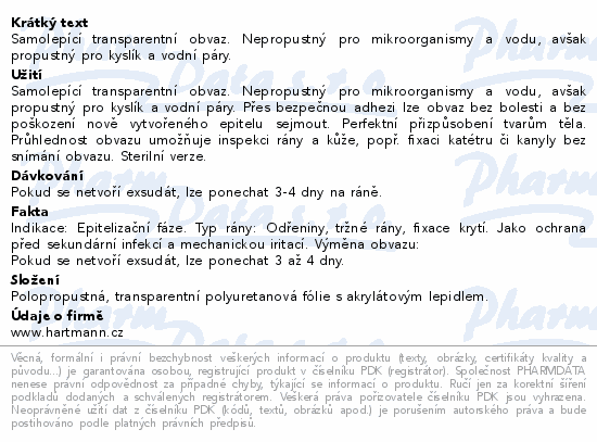 Samolepící transparentní obvaz. Nepropustný pro mikroorganismy a vodu, avšak propustný pro kyslík a vodní páry.