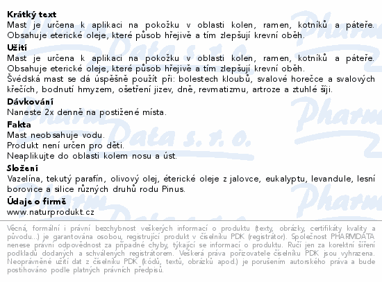 Mast je určena k aplikaci na pokožku v oblasti kolen, ramen, kotníků a páteře. Obsahuje eterické oleje, které působ hřejivě a tím zlepšují krevní oběh.