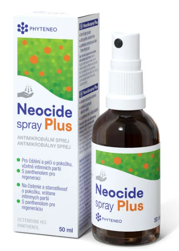 Bezoplachový sprej k očištění pokožky s antimikrobiálním účinkem. Phyteneo Neocide spray Plus je vhodný k péči o pokožku celého těla i zevní intimní hygienu. Čistí pokožku a poskytuje dlouhotrvající antimikrobiální efekt. Jeho složení bez alkoholu se vyznačuje vysokou snášenlivostí, obsažený panthenol pokožku chrání před vysušováním a přispívá k její regeneraci. Roztok je bezbarvý, nešpiní oblečení a jemně voní po citrusech.