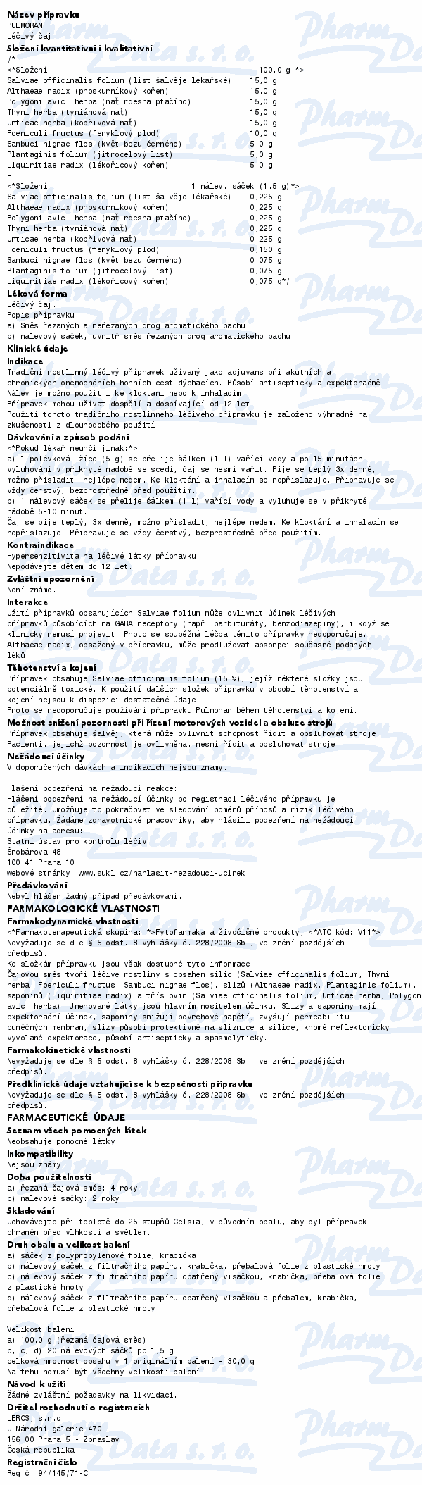 LEROS Pulmoran pomocný lék při chorobách horních cest dýchacích. Působí antisepticky, usnadňuje odkašlávání. Nálev je možno použít i ke kloktání nebo k inhalacím. Čtěte podrobně příbalový leták.