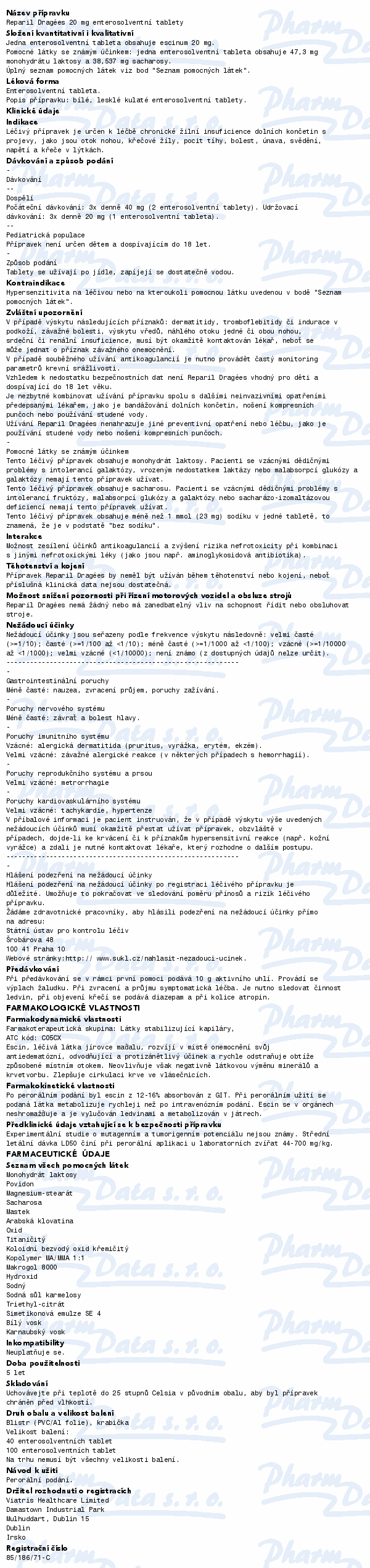 Léčivý přípravek Reparil-dragées je určen k léčbě chronické žilní nedostatečnosti dolních končetin s projevy jako jsou otok nohou, křečové žíly, pocit tíhy, bolest, únava, svědění, napětí a křeče v lýtkách. Čtěte pozorně příbalový leták.