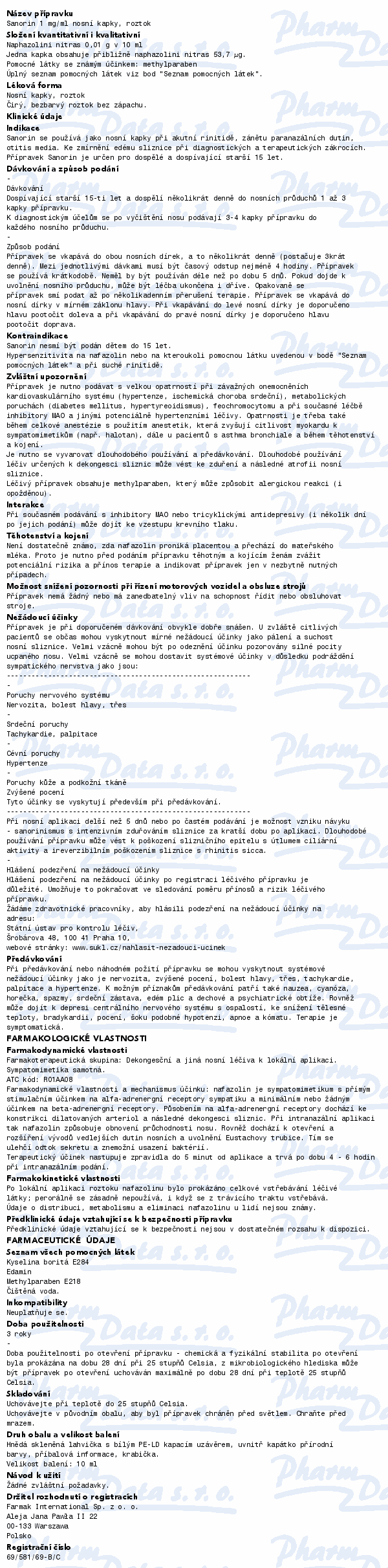 Sanorin 1 mg/ml uvolňuje ucpaný nos a vedlejší nosní dutiny. Zmenšuje otok nosní sliznice a uvolňuje hlen z nosu, vedlejších nosních dutin a trubice spojující střední ucho a hltan (Eustachova trubice). Tím umožňuje volné dýchání nosem. Přípravek Sanorin 1 mg/ml zmírňuje příznaky u akutní rýmy, zánětu vedlejších nosních dutin a zánětu středního ucha.