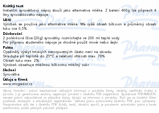 Instantní syrovátkový nápoj slouží jako alternativa mléka. Z balení 400g lze připravit 4 litry syrovátkového nápoje.
